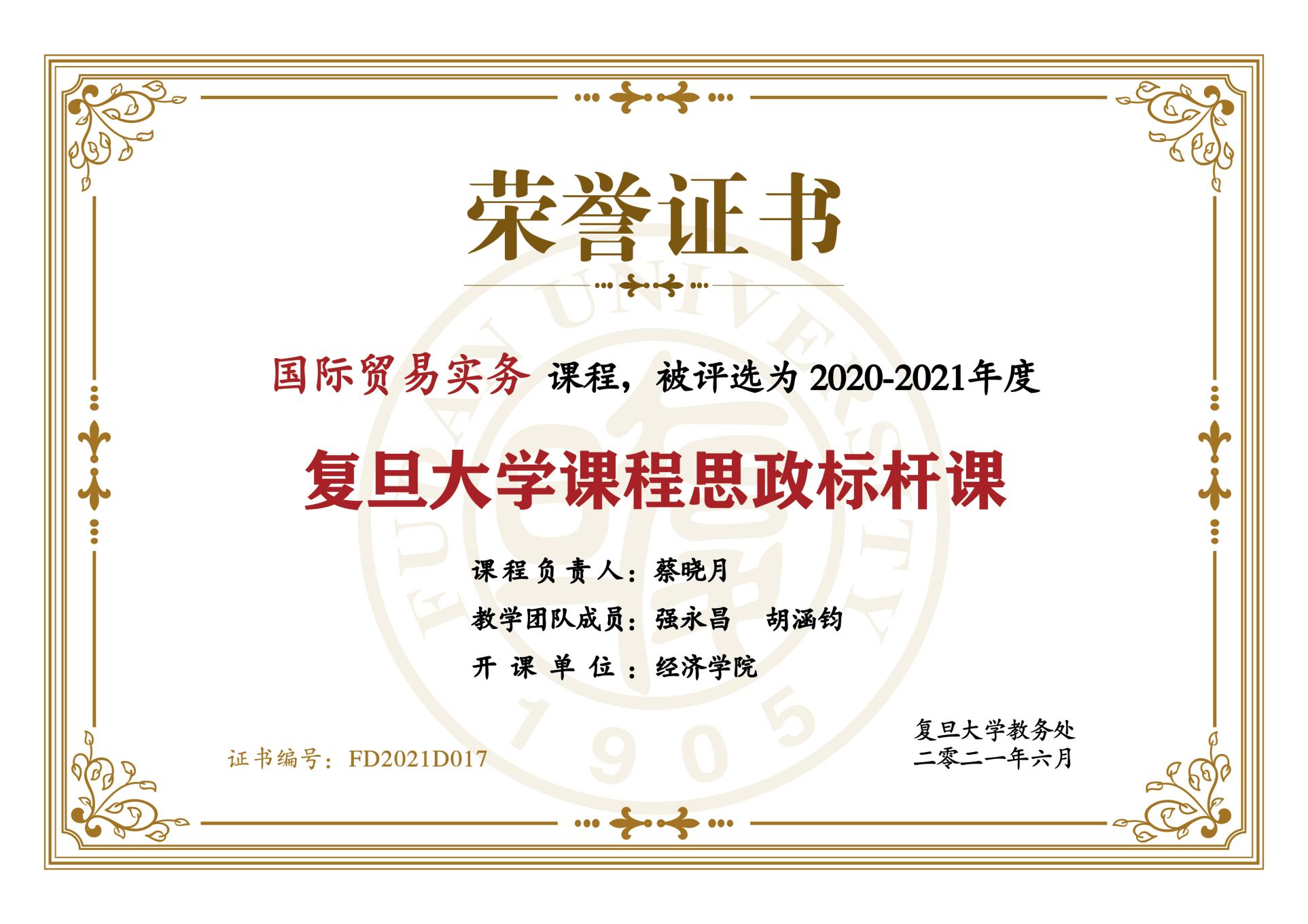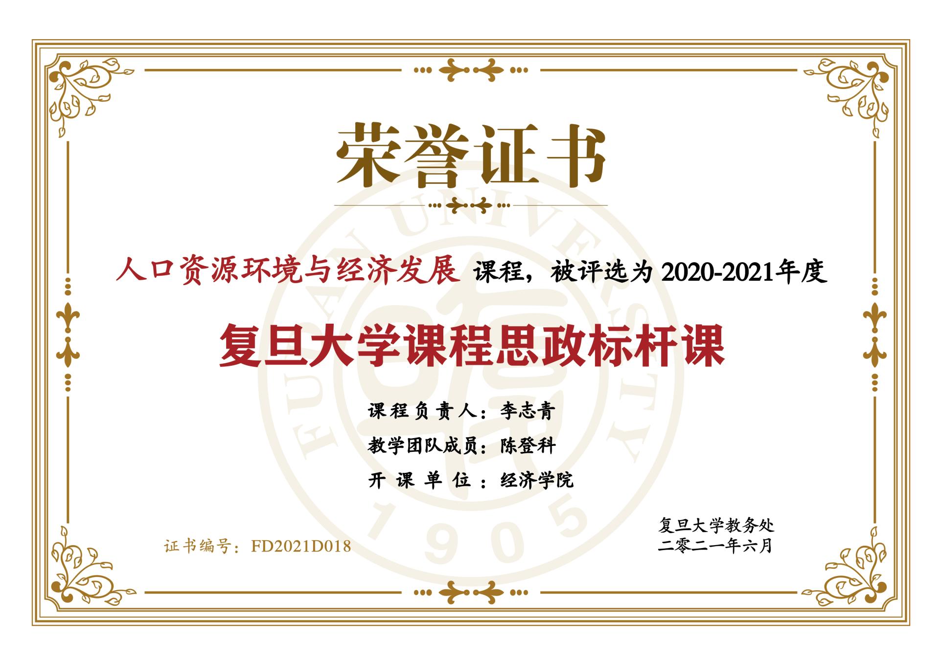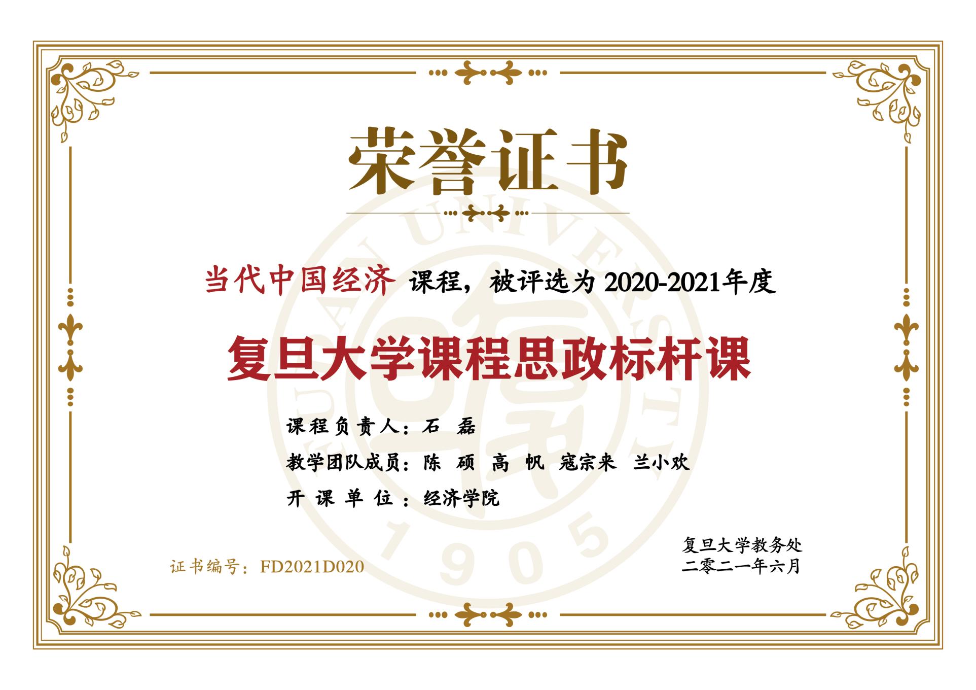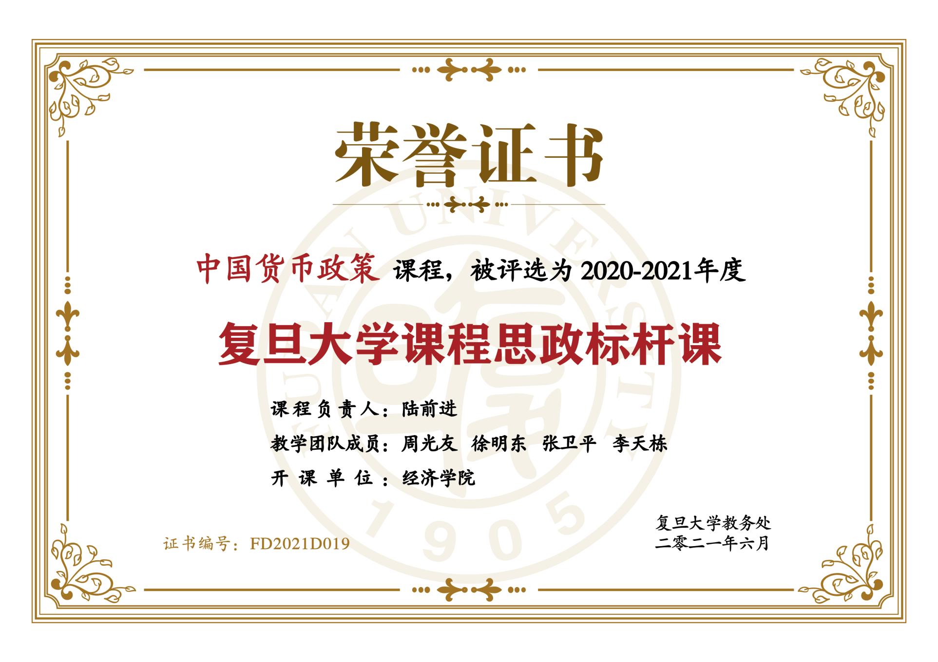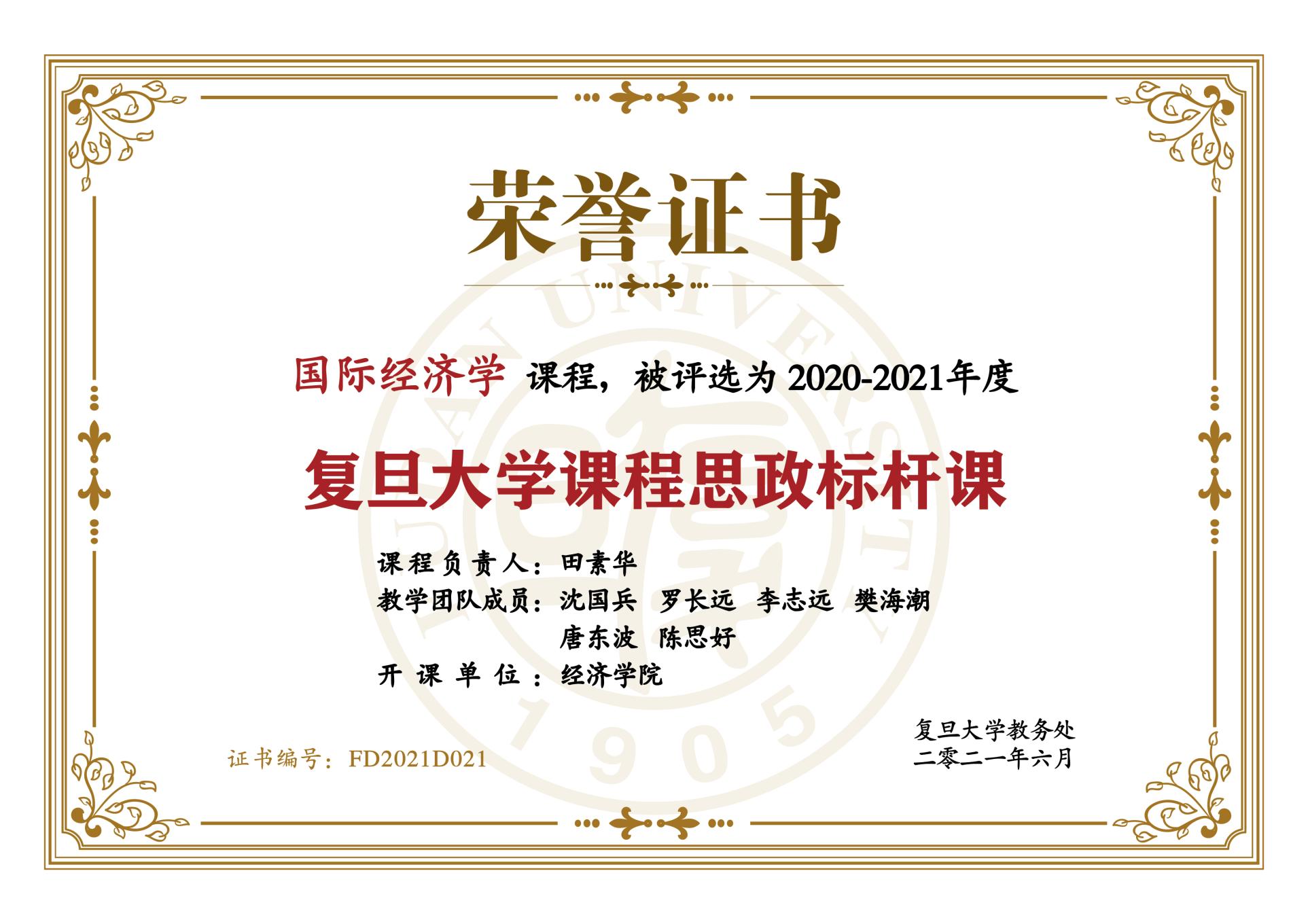 《当代中国经济》、《国际经济学》、《国际贸易实务》、《人口资源环境与经济发展》、《中国货币政策》等5门本科专业课程被评为2020-2021年度复旦大学课程思政标杆课程,全校(含医学)共60门课程获评。