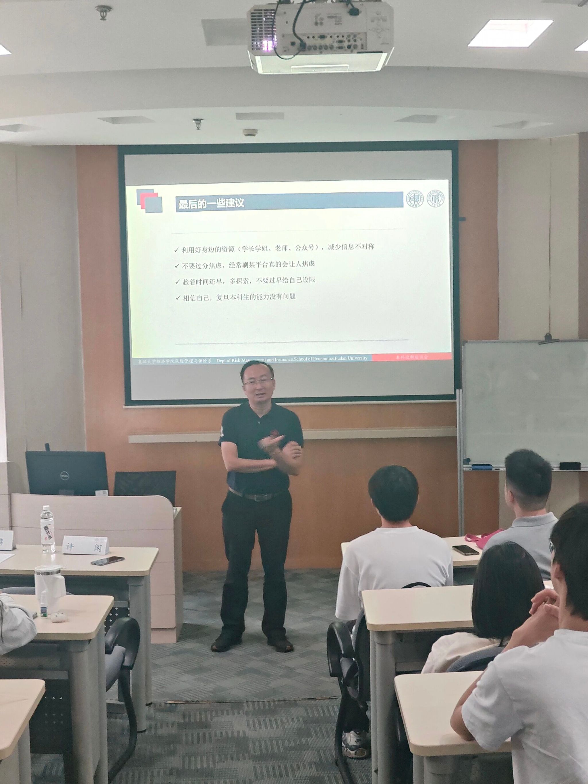 最后,他还特别强调,大家应当充分利用复旦的各种学习资源,学有余力可以主动旁听“精算软件应用”等相关课程,为之后的实习和就业储备硬实力。