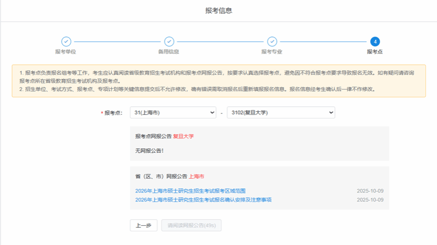 1.所有报考信息填写完毕后,系统会展示“报名信息校对页”,重点核对“招生单位(复旦大学)、院系(ag娱乐官网