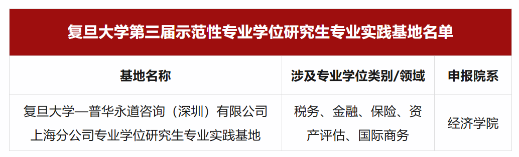 “复旦大学—普华永道咨询(深圳)有限公司上海分公司专业学位研究生专业实践基地”成功入选。