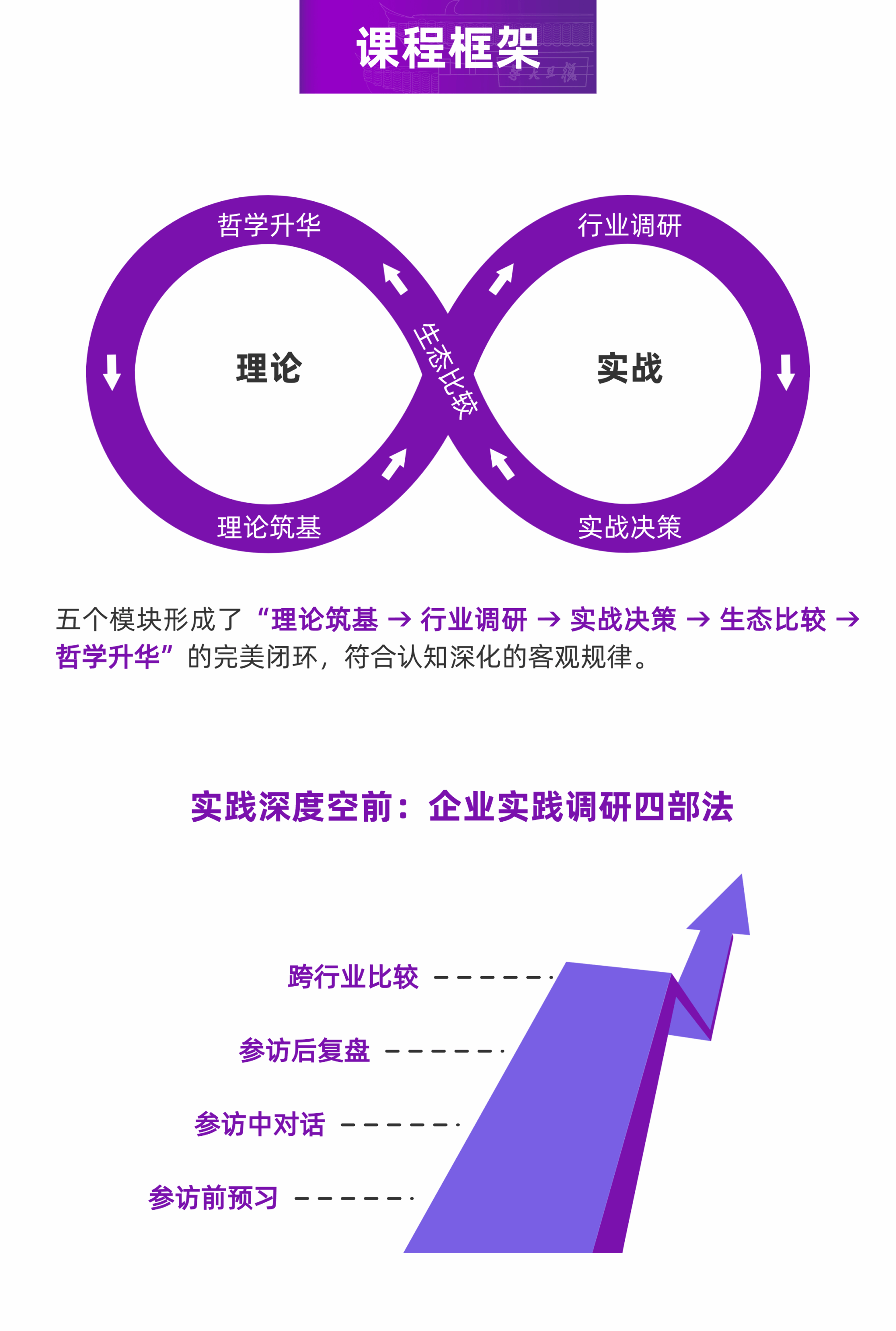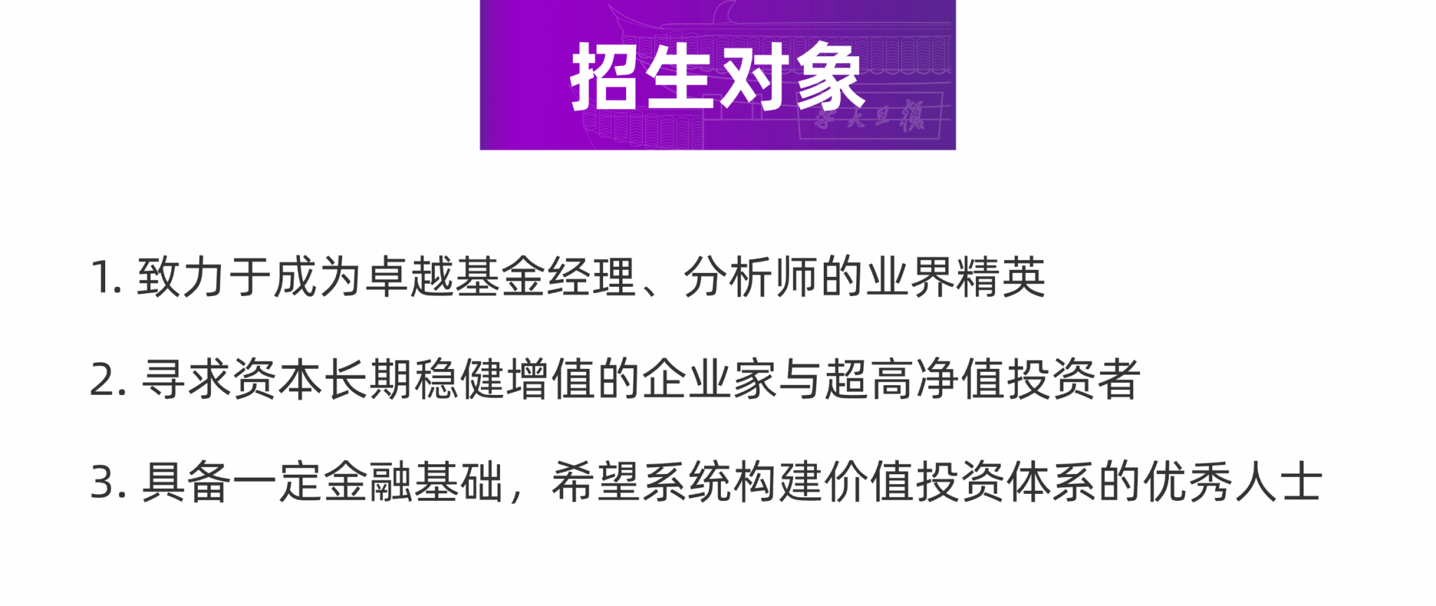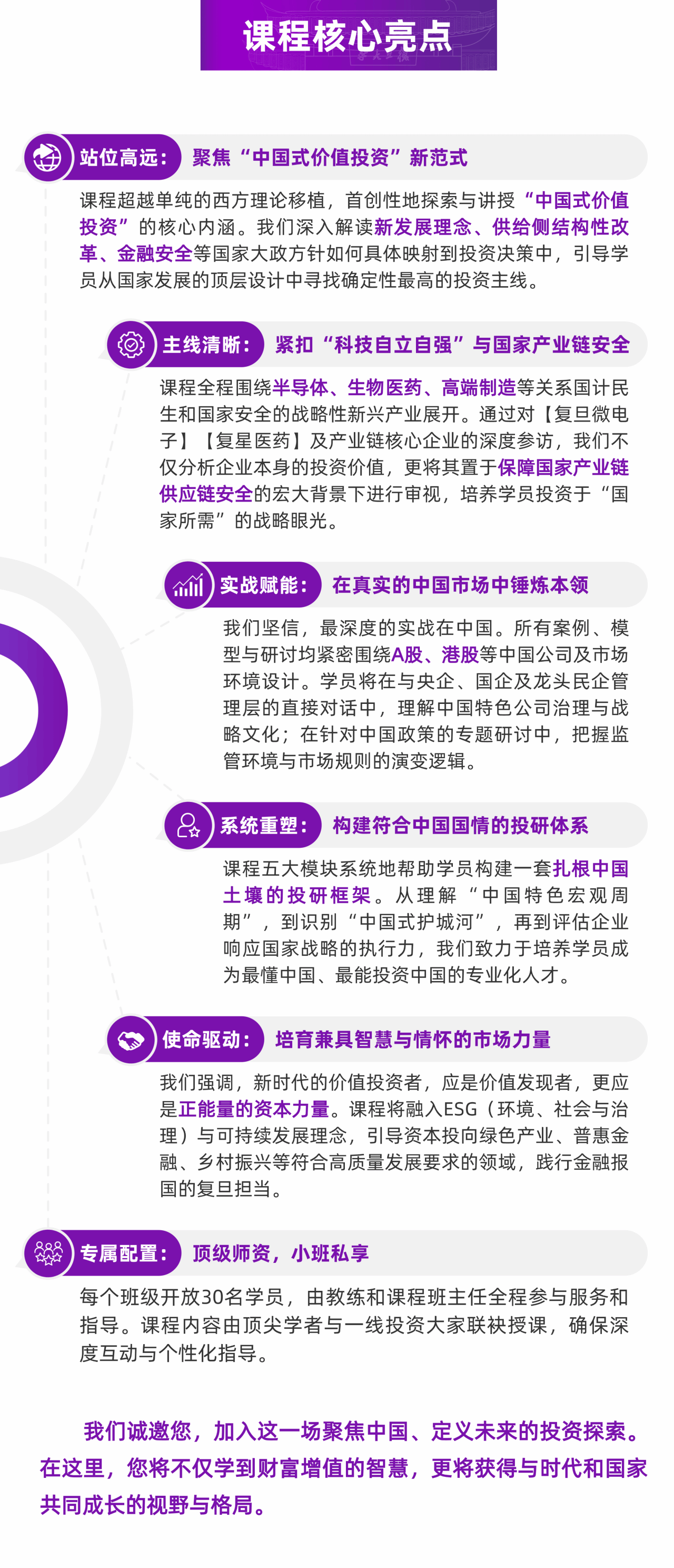 本课程旗帜鲜明地聚焦中国、立足本土,旨在培养一批不仅深谙价值投资精髓,更具备家国情怀与战略视野的新时代投资者。我们致力于搭建一个集系统理论、中国实践、政策解读与产业洞察于一体的国家级平台,助力学员在中国式现代化的伟大征程中,精准识别时代赋予的投资机遇,实现个人财富与社会发展的同频共振。课程将聚焦在 A 股、港股、美股上市的中国公司,通过四大紧密衔接的模块,引导学员完成从理论重构到实战决策的完整闭环。
