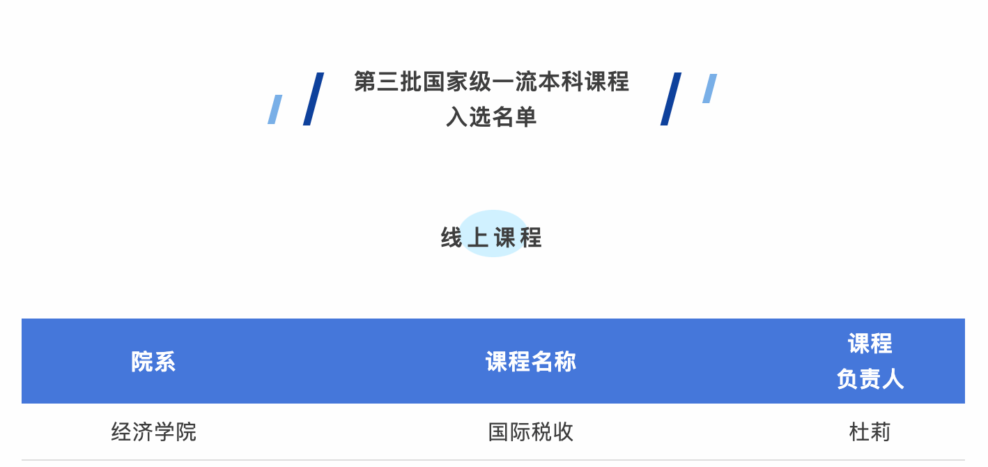 杜莉教授主讲的线上课程《国际税收》入选第三批国家级一流本科课程,我院累计共有10门课程入选国家级一流本科课程。