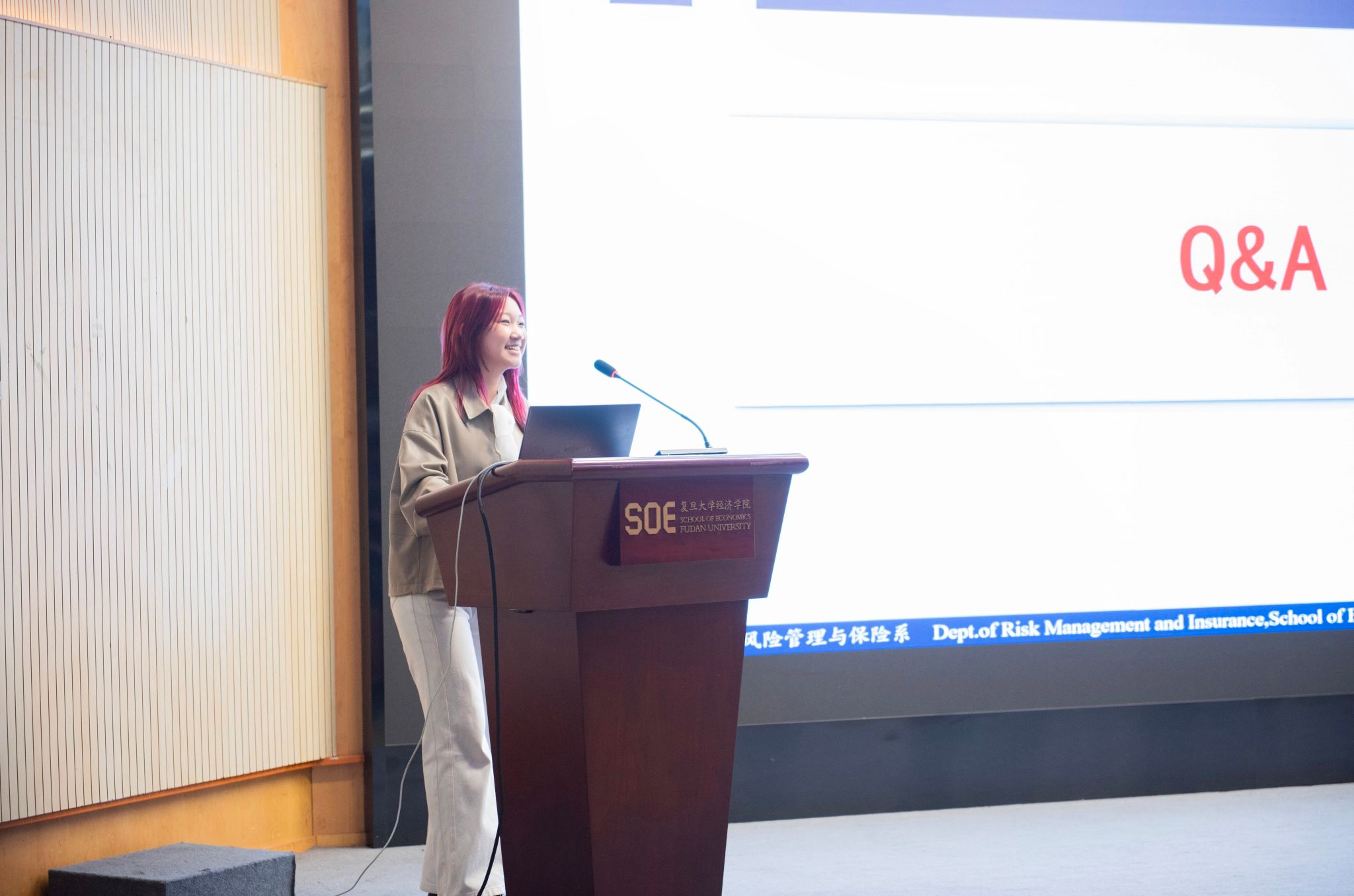在互动环节,2023级王紫晶同学(复旦大学风保协会活动部部长、复旦大学优秀志愿者)带着保险系的满满祝福为现场同学们揭晓了神秘礼物。在这样轻松的时刻,同学们也提出了各自的疑问和困惑,涉及课程推荐、学业压力、不同国家精算师的路径选择与发展前景(中精、美精和英精体系的比较)等诸多方面。
