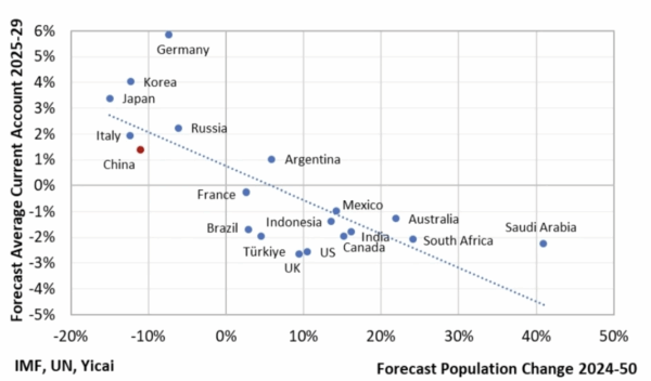 最近我注意到国际货币基金组织(IMF)有一个研究,把一些国家未来几十年的人口变动情况作为一项非常重要的指标,然后结合这些国家的经常项目余额进行回归分析,得出的结论很有意思。