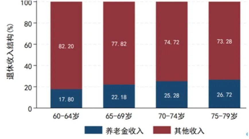 公共养老保险的作用在于为老年生活提供基本保障,但这一点在农村老年群体生活现状中却未能体现。我们采用中国家庭金融调查(CHFS)这一覆盖全国大部分省份的样本,对2021年4646个户主在60岁及以上农村老年家庭进行分析,结果发现,农村老年家庭收入中的养老金收入占比极低,而且户主越老的家庭占比越低。60-64岁群体养老金收入占比26.72%,75-79岁群体更是降至17.80%,其余收入均依赖转移性收入、农业收入等。