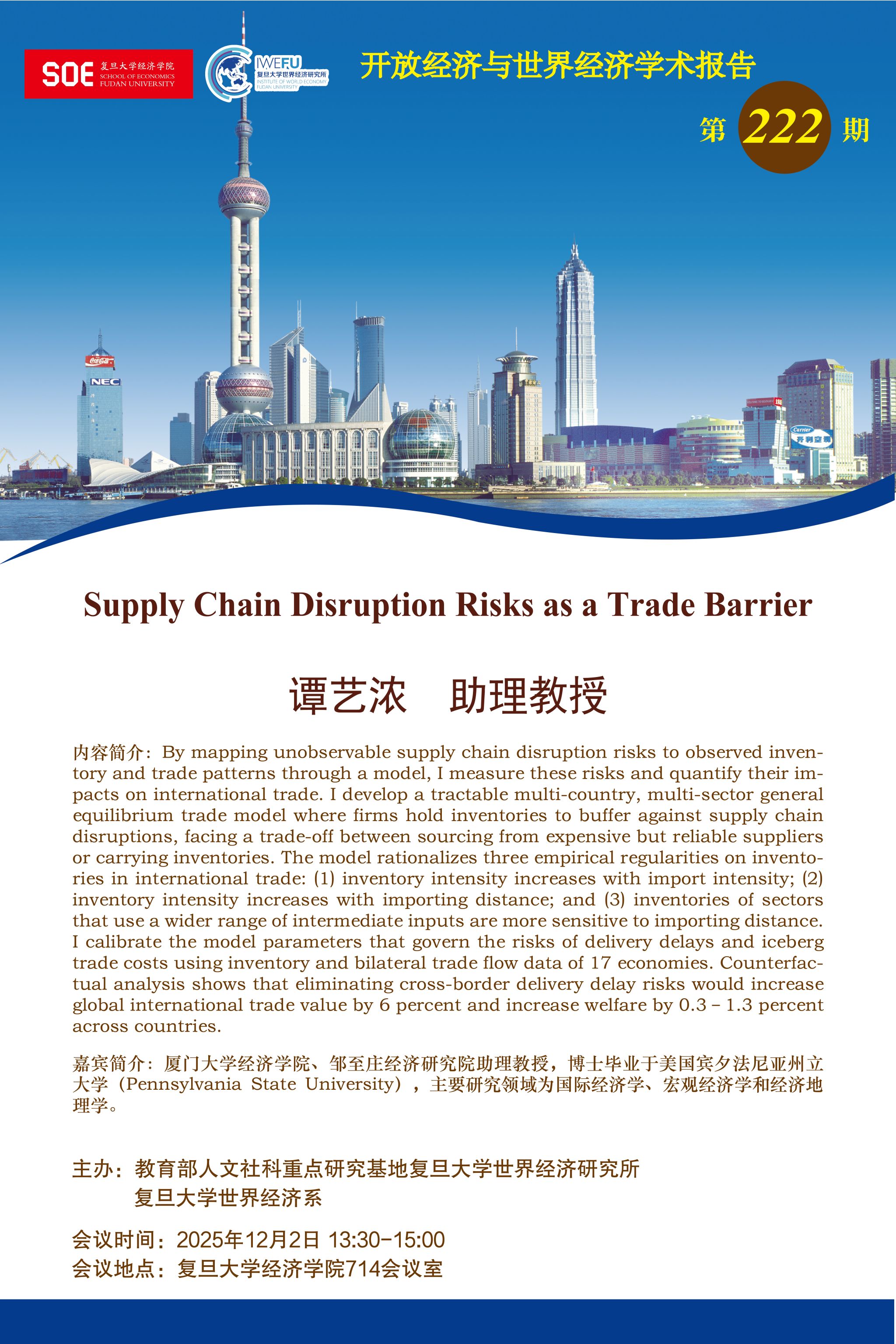 复旦大学世界经济研究所开放经济与世界经济学术报告第222期:Supply Chain Disruption Risks as a Trade Barrier