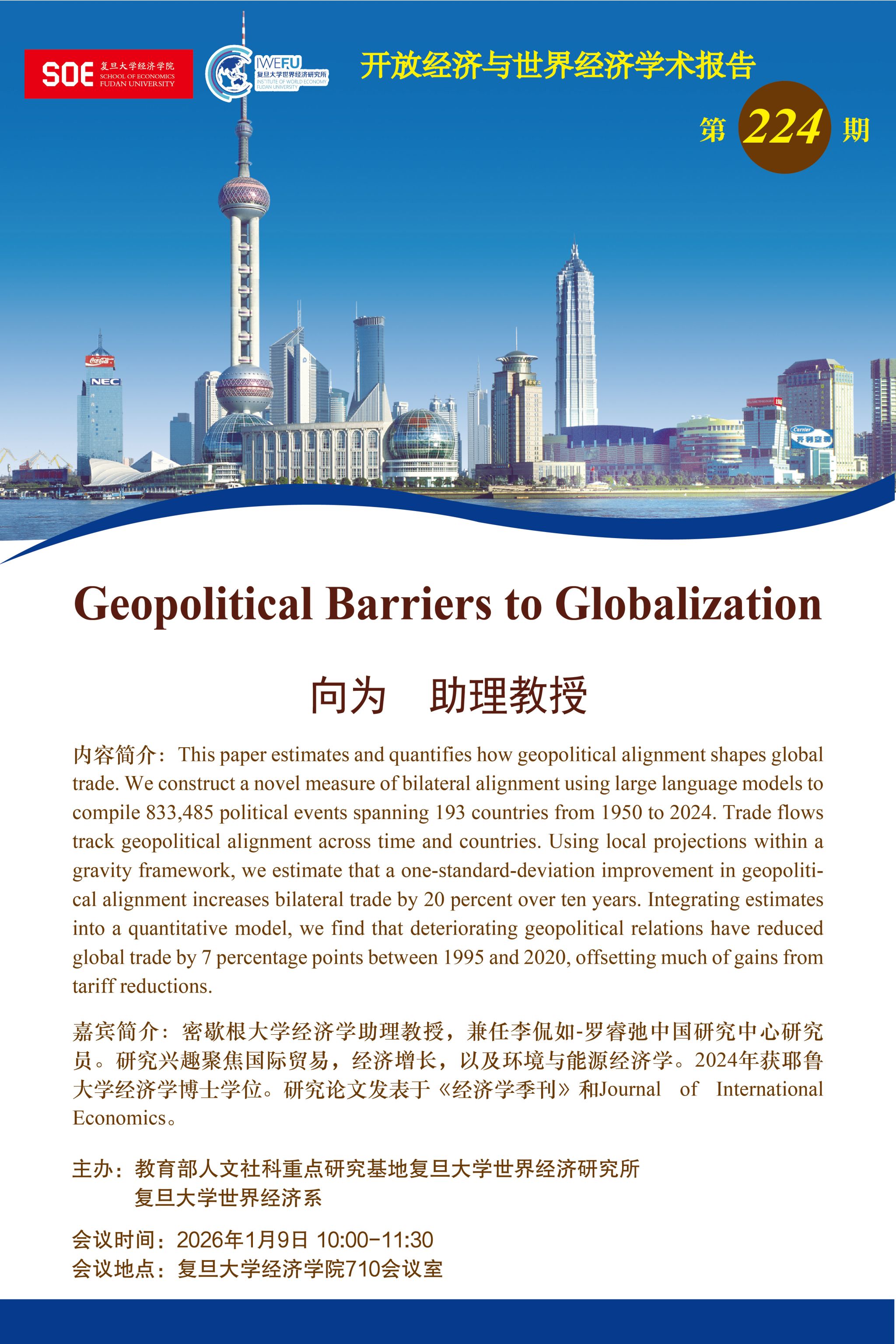 复旦大学世界经济研究所开放经济与世界经济学术报告第224期:Geopolitical Barriers to Globalization